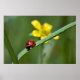 Una mariquita (también conocida como ladybird o ladybeetle) dando un paseo a lo largo de una hoja de hierba con una flor de hierba amarilla en el fondo. Fotografía de macro tomada en el Reino Unido. Personalizar para agregar su propio texto y otras opciones.