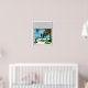 Playa y mares tropicales azules, escena de ventanas falsas, para un cuarto de baño sin ventanas o pared de oficinas. Divertido, realista poster óptico de ilusión para una oficina o pared de estudio.