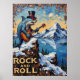 Esta vibrante pintura retrata a un tiburón estilizado, con un sombrero superior y gafas de sol rojas frescas, tocando ferozmente una guitarra eléctrica en lo alto de un pico con polvo de nieve. Abajo, un mar azul vibrante está salpicado de helados, y a lo lejos hay montañas escarpadas y nevadas. El grueso y difícil trabajo de pincel de la obra de arte da una textura lúdica y energética al paisaje helado, complementando perfectamente el tema "ROCK y ROLL".