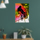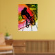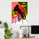 La acción deportiva y la energía de los atletas BMX se capturan en siluetas de figuras de acción que demuestran trucos extremos y maniobras en sus bicicletas. Los cuadros y ilustraciones digitales de estos adolescentes y jóvenes incluyen antecedentes de colores vivos y brillantes y salpicaduras y ráfagas de luz para resaltar la acción. También se exhiben en escenas de calles agrias y poco fiables donde los niños ganan sus criados en la calle mostrando sus habilidades en bicicleta.