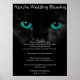 Esta hermosa bendición boda de apache, que empieza con "ahora no sentirás lluvia. con un gato negro con ojos turquesa mirándote texto blanco y fondo negro.