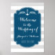 Personalizable bienvenido a nuestro poster de señas boda con amplio patrón de rayas vintage y barcos náuticos clásicos anclados y florales en azul marino oscuro, gris y blanco.