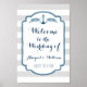 Personalizable bienvenido a nuestro poster de señas boda con amplio patrón de rayas vintage y barcos náuticos clásicos anclados y florales en azul marino oscuro, gris y blanco.