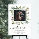 Esta señal de bienvenida de boda con foto presenta eucalipto pintado con acuarela, vegetación, hojas verdes, bayas rojas, ramas de pino con un marco cuadrado verde. Para una personalización más avanzada de este diseño, haga clic en el enlace "Personalizar más". También están disponibles artículos que coinciden.
