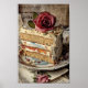 Esta imagen de medios mixtos muestra una deliciosa rebanada de pastel de boda, con toda la elegancia y sofisticación de una ocasión especial. La tarta es una obra de arte en sí misma, con su superficie perfectamente lisa y sus delicadas capas de esponja y crema. La parte se sitúa sobre un fondo de guijarros que añade un toque de encanto vintage a la imagen. El fondo presenta un collage de diferentes elementos, incluyendo fotografías antiguas, notas manuscritas y patrones delicados. El efecto general es de elegancia atemporal, que refleja el romanticismo y la alegría de un día de boda.