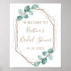 Esta señal personalizada de ducha de la novia botánica dará la bienvenida a sus invitados con estilo. Esta plantilla de diseño moderno cuenta con un marco geométrico dorado metálico falso acentuado por vegetación de eucalipto pintada a mano con acuarela. Personalice con un nombre y fecha de ducha en tipografía dorada falsa moderna y manuscrita. Por favor, eche un vistazo a nuestra tienda I Love Weddingz para encontrar más selecciones en esta colección. Diseñado por la artista Susan Coffey.