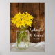 El encantador cartel de boda de granero campestre en tarro de Mason y margaritas amarillas es un gran recuerdo para tu tema de boda rural de granja o rancho casual pero elegante. Esta impresión nupcial personalizada de estilo rústico chic presenta una encantadora fotografía floral de un ramo de flores de margarita amarilla en un tarro de vidrio para enlatar sobre satén blanco con un fondo de madera de granero marrón desgastado.