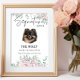 El encantador cartel de la firma de perro de Pomerania presenta un hermoso diseño de mascota floral al estilo de las acuarelas, perfecto para un boda saturado de tonos neutros. Es una forma atractiva de acentuar el cóctel, la comida o la mesa de postres. Personalice el cartel de la barra del boda con el nombre del mascota y los detalles de la bebida.
