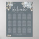 Este diseño presenta un gráfico de bienvenida de boda con flores, mesa de bienvenida elegante azul polvoriento, flores de rosa botánica sencillas, ramo de jardín elegante con verde, hojas de rosa pálido y verde follaje, mesa de invitados con número y nombre, una caligrafía elegante y moderna, tipografía caprichosa, cartel de bienvenida de boda, decoración de recepción de boda moderna y elegante