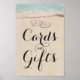 Cartel personalizado de la fiesta de bodas con fondo de isla de verano tropical oceánica, una playa de arena vintage con dos corazones en la costa, sus iniciales y las palabras "tarjetas y regalos".