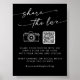 Este boda negro de boho comparte el amor que el poster de código QR es perfecto para un boda minimalista. El moderno diseño bohemio presenta una caligrafía rústica sencilla con un estilo único y clásico. Perfecto para cualquier temporada: primavera, verano, otoño o invierno. Introduzca su dirección web en la sección de código QR de la plantilla y el código QR se actualizará automáticamente y se vinculará a su sitio. Personalice el cartel con la etiqueta de su boda para compartir fotos en los medios sociales.