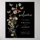 Boho Black Welcome Boda Poster. Este elegante y elegante poster de bienvenida para bodas cuenta con una hermosa mariposa acuática pintada a mano y flores silvestres dispuestas como un bonito ramo. Encontrar elementos coincidentes en la colección Boda de Flor silvestre Moody Black Boho.