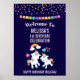 Un poster de bienvenida de cumpleaños con dos hermosos unicornios bailando con colas brillantes y coloridas, y hombres. Un arcoíris colorido con nubes en cada lado sobre sus cabezas. Otros elementos son una flor, un corazón y algunas estrellas. Fondo morado oscuro. Coloridos puntos de confeti y una concha de imagen a lo largo de la parte superior.