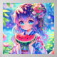 Bonito acuarela arte que representa a un lindo chica de anime con el pelo morado comiendo sandía en un caluroso día de verano.