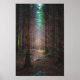 Fotografía paisajística de un bosque de abetos oscuro y misterioso con un toque verde y una luz brillante en el fondo.