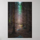 Fotografía paisajística de un bosque de abetos oscuro y misterioso con un toque verde y una luz brillante en el fondo.