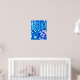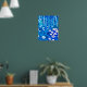 Poster en un ilustracion semi-abstracto de un bosque de fantasía con flores, follaje, árboles y pájaros, en tonos cobálticos azules y blancos