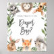 Dé a sus invitados una dirección encantadora con nuestros animales de bosque de bosques adivinen qué hay en el cartel de la bolsa de pañales, con la vegetación acuática de eucalipto garland y elegante letra de estilo manuscrito.