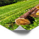 Con un campamento forestal, con troncos envejecidos en una pila, escondidos en un valle justo al lado de un bosque verde brillante.