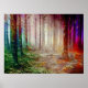 Una escena de bosque caprichoso con árboles pálidos parecidos a los pájaros y salpicaduras de ricos verdes, rojos y violetas.