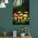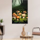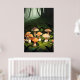 Un conjunto de naranjas vivos y setas blancas con manchas blancas se alzan en un entorno verde y exuberante. Las setas están dispuestas en un semicírculo, con las tapas inclinadas hacia el espectador. El suelo del bosque está cubierto por una alfombra de hojas y musgos verdes, con árboles altos y oscuros en el fondo. El aire está denso de niebla, creando una sensación de misterio y encantamiento.