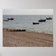 Varios barcos de pesca están dispersos a través del mar tranquilo cerca de una playa de guijarros bajo un cielo nublado. Un rompeolas de madera se adentra en el agua, marcando el límite del área de la playa. Anclados en la costa, los distintos barcos están dispuestos en hileras por la corriente y las olas. No son botes de remo reales, sino hileras de barcos que la naturaleza ha hecho simétricos.