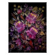 Un cuadro vibrante de flores de lila sobre un fondo oscuro al estilo tradicional de Petrykivka. La composición presenta intrincados patrones florales, con delicadas y amplias pinceladas que crean una sensación de movimiento y elegancia. Las flores están rodeadas de hojas ornamentales y pequeños detalles decorativos en tonos verdes, amarillos y blancos, que contrastan con el fondo oscuro.