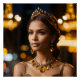Retrato cinematográfico de una mujer llamativa iluminada por una cálida iluminación dividida de color bronce. Lleva una lujosa joyería de bronce adornada con citrina, ámbar y topaz amarilla, que incluye una tiara escultórica, audaces aretes de araña y un collar de collar en capas. Su vestido de auburn oscuro complementa el bokeh nocturno de la ciudad dorada en un fondo suavemente borroso, creando una atmósfera glamurosa y opulenta.