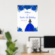 This birthday party welcome sign features faux glitter royal blue floral flowers and a beautiful princess with brown hair and an elegant dress. This is perfect for a birthday party.