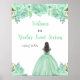This sweet sixteen welcome sign features faux glitter mint green floral flowers and a beautiful princess with brown hair and an elegant dress. This is perfect for a sweet sixteen birthday party.