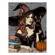 bruja estilo retro posando con su gato negro y sus tomes antiguos.