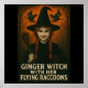 Bruja De Ginger Con Su Poster Volador De Racconones V2. La bruja jengibre, pálida y siniestra, se acercó a través del bosque espeluznante sobre su palo de labranza al atardecer, y se detuvo para tomar una instantánea, mientras sus mapaches voladores discutían ruidosamente sobre aperitivos, gorras y quién consiguió el asiento delantero.