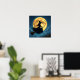 Una bruja volando sobre su escoba frente a una luna llena en el poster nocturno de Halloween.