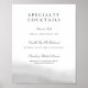 Diseñado para coincidir con nuestra colección de bodas Mist, este elegante cartel es perfecto para su estancia en el bar para compartir sus creaciones de cócteles especiales con los huéspedes. Personalice el encabezado y seis campos de texto sobre una capa de color gris claro.