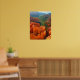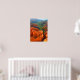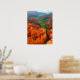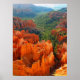 Bryce canyon Utah poster DE 8.99 . El cañón de Bryce no es un cañón, sino un anfiteatro natural gigante creado por la erosión a lo largo del lado oriental de la meseta de Paunsaugunt. Las palabras se confunden cuando no existen comparables. ¿Una cueva sin techo? ¿Un bosque de piedra? Incluso el "cañón" es engañoso, ya que Bryce está tallado por ciclos de deshielo, no por un río. Sin embargo, el "bache más grande del mundo" no es ni adecuado ni halagador. Bryce es distintivo debido a estructuras geológicas llamadas hoodoos, formadas por el viento, el agua y la erosión de hielo de las rocas sedimentarias del lecho del río y del lago. Los colores rojos, naranjas y blancos de las rocas ofrecen unas vistas espectaculares a los visitantes del parque. Bryce se encuentra en una altitud mucho mayor que el cercano Parque Nacional Zion. Espectacular en cualquier época del año esta maravilla del mundo añadirá majestuosidad y profundidad a cualquier habitación