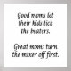 Un diseño gracioso dice, en letras negras, "Las buenas mamás dejan que sus hijos laman a los beaters. Las grandes mamás apagan primero el mezclador". Genial para una risa y para los que tienen buen sentido del humor o del humor. Un regalo fabuloso para cualquier niño, viejo o joven en un cumpleaños, en Navidades, Kwanzaa. Genial para mamá en el Día de la Madre también.