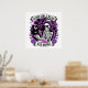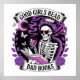 Un diseño colorido y vibrante muestra a una esqueleto femenina leyendo un libro mientras toma un cóctel al vapor. A su alrededor hay flores moradas y mariposas, que se suman a la estética animada. El texto audaz y colorido dice: "Los buenos chicas leen libros malos". Este diseño único está disponible en una amplia gama de productos.