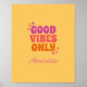 Diseño personalizado de Good Vibes en un ambiente de buen verano en tipografía de estilo amarillo y retro. - Colores cálidos y brillantes de verano - Tipografía retro con comillas inspiradoras positivas - Fáciles de editar plantillas para añadir su nombre. Puntee en perzonalizar esto para personalizar el texto y los colores y fuentes personalizares. Si necesita ayuda con la personalización, productos coincidentes o para un diseño personalizado, póngase en contacto conmigo a través de zazzle chat o correo electrónico: ursuladawnmoon@gmail.com