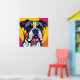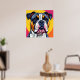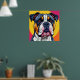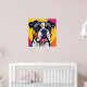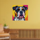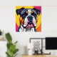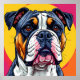 Ilustración vibrante y cercana de la cara de un bulldog. El perro tiene ojos expresivos y un patrón de pelaje distintivo con colores negro, blanco y marrón atrevidos, sobre un fondo abstracto y brillante de formas circulares en tonos rosa y amarillo.