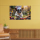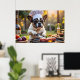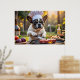 Esta encantadora imagen cuenta con un Bulldog francés blanco y negro, con un gorra y un delantal de un chef blanco, que asan con diligencia un bistec al aire libre. Con una expresión centrada y un utensil de cuchillo/tenedor en pata, el adorable chef canino se ocupa de la carne en los resplandecientes bordados, mientras que la cálida luz del sol inunda el lugar. En la mesa rústica se pueden ver botellas y garnieves, lo que crea un ambiente acogedor en el patio trasero.