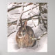 Este poster de fotografía artística presenta una escena típica de invierno: un conejo de cola de cottontail marrón dulce con orejas grandes se esconde bajo un pino buscando refugio de la tormenta de nieve.