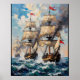 Esta pintura captura una escena dramática de dos grandes barcos de vela luchando contra un mar agitado y agitado. La obra de arte presenta una técnica de gran dificultad, con pinceles gruesos y expresivos que dan a las olas una calidad escultural y tridimensional. Los barcos, con sus velas y sus banderas rojas, están contra un turbulento cielo lleno de nubes tormentosas. La composición general evoca una sensación de aventura y el poder de la naturaleza.
