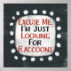 Un diseño tipográfico de animales irreverente que dice "Disculpe, sólo estoy buscando mapaches". Presenta texto en negro y rojo sobre un rectángulo blanco con puntos blancos divertidos y juguetones rodeándolo, todo sobre un fondo gris.