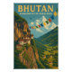 Afiche de viajes estilo retro de Bután, enclavado en los Himalayas. En primer plano, el majestuoso Paro Taktsang (monasterio del nido del tigre), encaramado espectacularmente en un acantilado, con sus paredes blancas y sus tejados rojos resplandecientes bajo la luz del sol