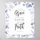 Bible verse from Ephesians 2:8, 'For it is through Grace you have been saved through fatih.' Elegant chinoiserie design features watercolor blue flowers with text inside a classic arch.