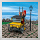 Representación digital 3D de un taxi-taxi a vapor y una linterna sobre el cielo azul y el fondo de la gran ciudad, efecto de pintura