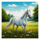 Este colorido cartel muestra un caballo blanco de pie en un campo de hierba, con flores silvestres y árboles. Un gran regalo para decorar tu pared, para todos los amantes de los caballos, mamíferos y animales.