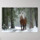 Un poster con una fotografía de un caballo marrón con una larga melena blanca. En un bosque con copos de nieve cayendo por todos lados.