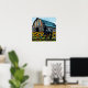 Caballo negro de bonito parado frente a un antiguo granero rústico rodeado de girasoles poster.
