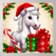 Ilustracion de un alegre caballo blanco vestido con un sombrero de Papá Noel rodeado de regalos de Navidades, ramas y latas de dulces en un nevado entorno vacacional que muestra un encanto evocador de temporada y festividad.